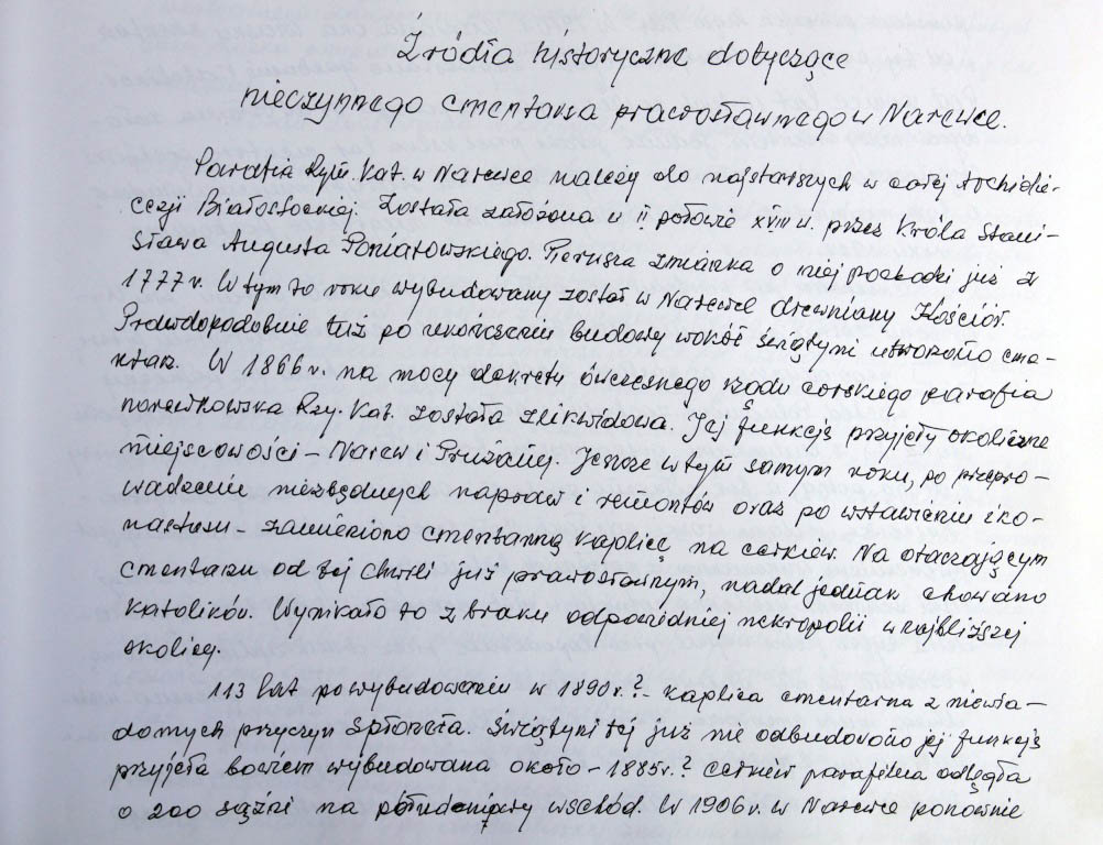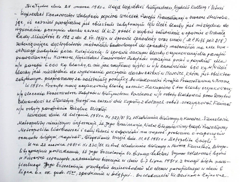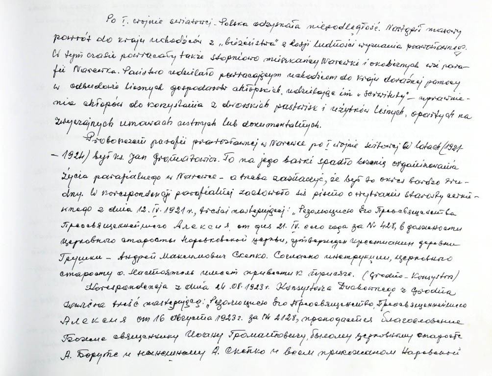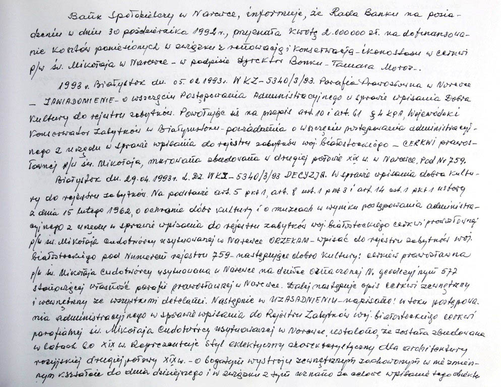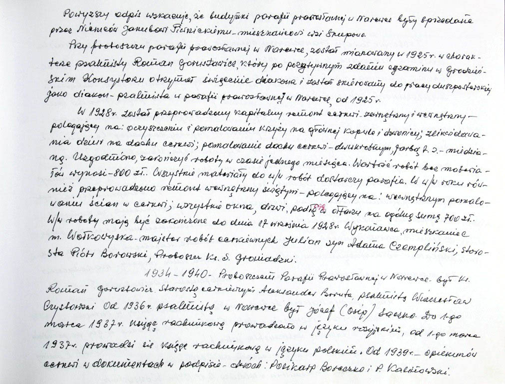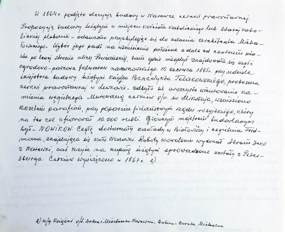 Informacje zebrane o historii cerkwi w Narewce przez proboszcza ks. Białomyzego.