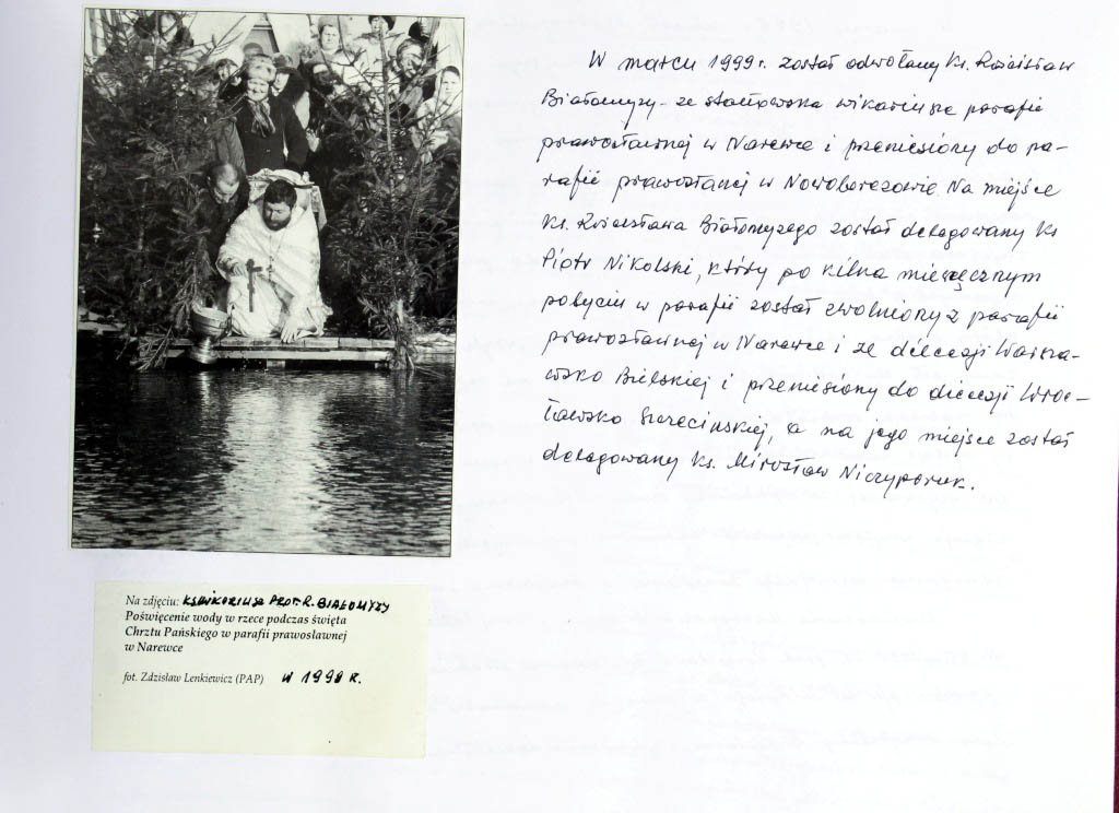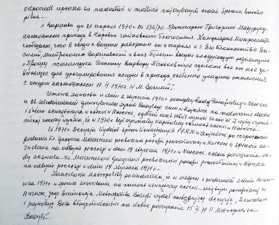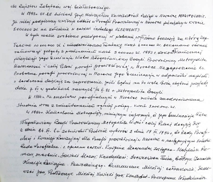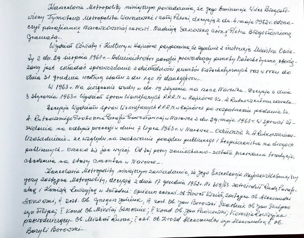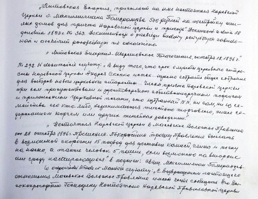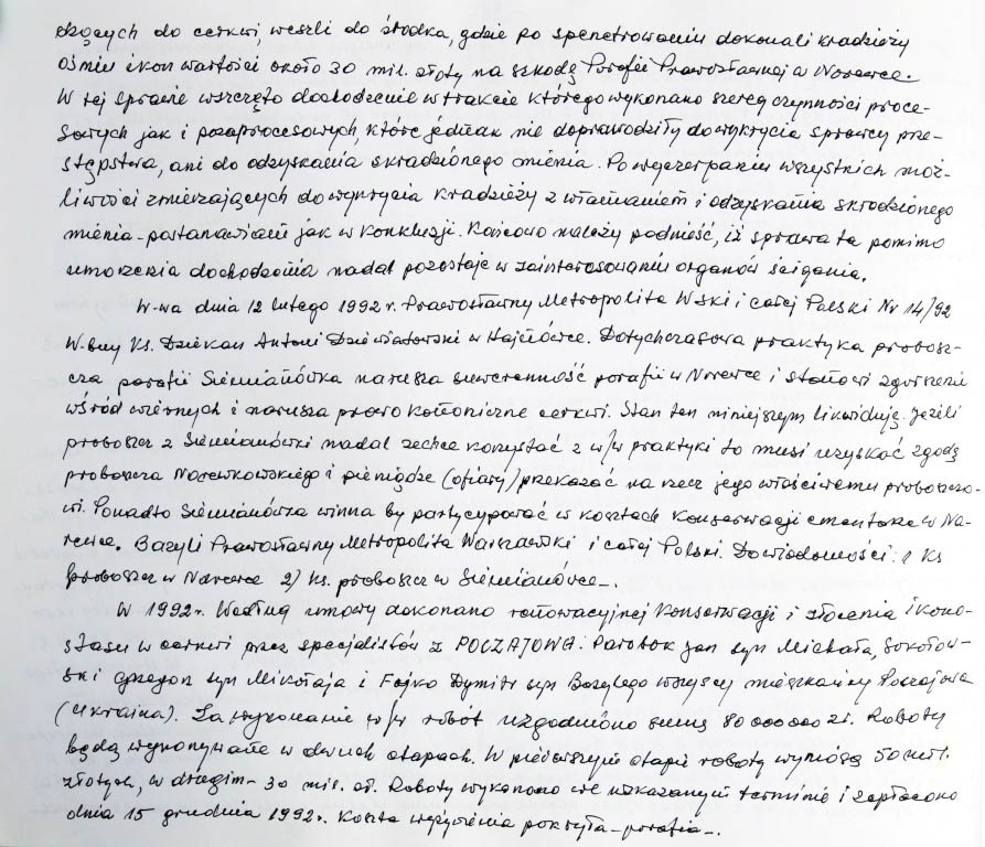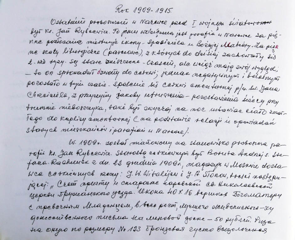 Informacje zebrane o historii cerkwi w Narewce przez proboszcza ks. Białomyzego.